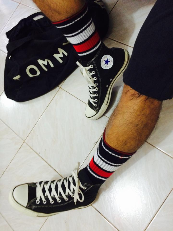 about my style: an old black pants teared into walking short, i matched it with my black high cut Chuck Taylor all star with Theothis Stancesocks, and Tommy duffle bag as props